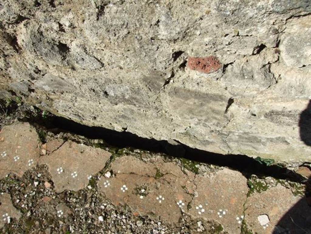North wall of caldarium. Remains of hollow walls for hot air and decorated hypo-caustic cocciopesto floor.