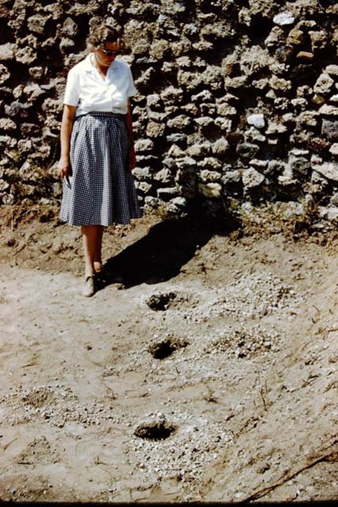 IX.9.6/10 Pompeii. 1961. Wilhelmina near west wall studying the emptied root cavities.
